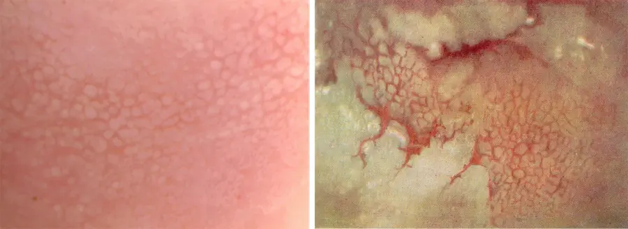Появляются зоны скопления избыточно растущих клеток. Для обеспечения этих клеток питанием вокруг них формируется сосудистая сеть. Визуально эта сеть проявляется как пунктация и мозаика.