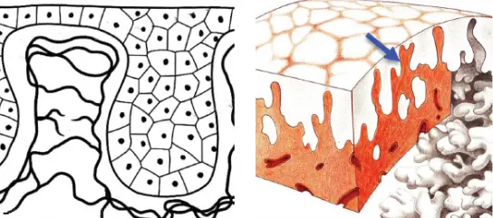 Это зоны эпителия, границы которых окруженные капиллярами. Мозаику можно сравнить с островками, плотно разбросанными по поверхности реки. Или с мозаичным панно.