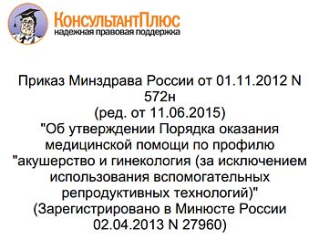 Приказ Минздрава России от 01.11.2012 N 572н (ред. от 11.06.2015) "Об утверждении Порядка оказания медицинской помощи по профилю "акушерство и гинекология"
