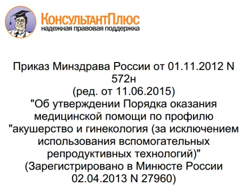 Приказ Минздрава России от 01.11.2012 N 572н (ред. от 11.06.2015) "Об утверждении Порядка оказания медицинской помощи по профилю "акушерство и гинекология". Ссылка на документ.
